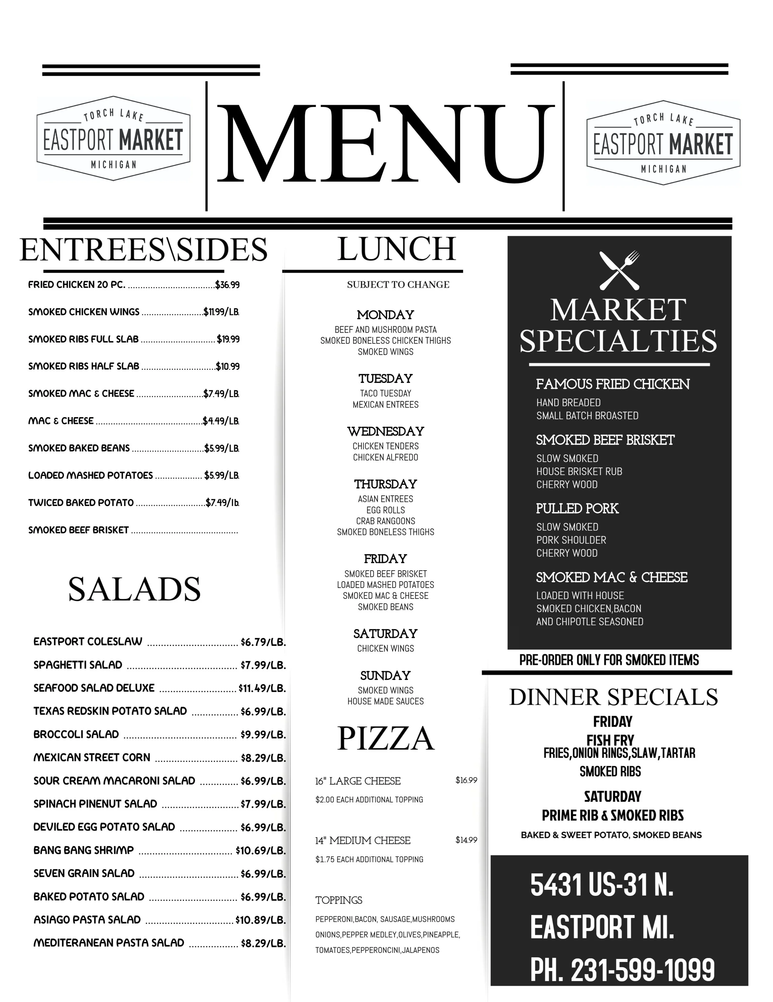 Toppings: Pepperoni, Bacon, Sausage, Mushroom, Onions, Green Pepper, Olives, Pineapple, Tomato, Pepperoncini, Jalapeño and more available upon request.